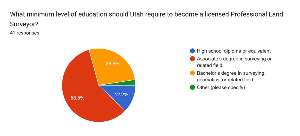- Most respondents (36 out of 61) suggest an “associate’s degree in surveying or related field” as the minimum education level.