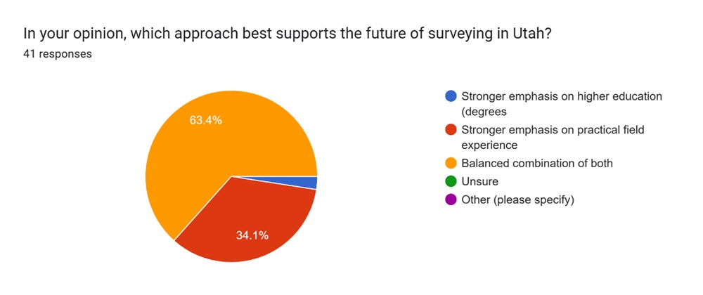 - An overwhelming majority of respondents (43 out of 61) favor a “balanced combination of both” practical field experience and higher education for the future of surveying in Utah.