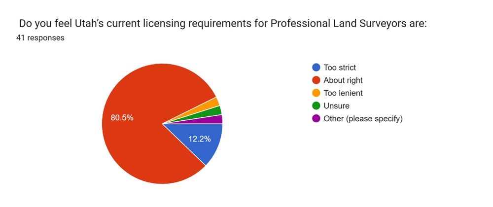- Most respondents (49 out of 61) believe that Utah’s current licensing requirements for PLS are “about right.”